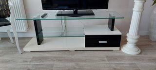 Meuble bas tv moderne laqué blanc - plateau en verre de 10mm, - étagère en verre de 8mm, - 1 tiroir. Dimensions : L 1,40m, l 0,40m, h 0,50m À enlever sur place contre paiement