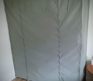 Penderie en kit ( tube en fer avec raccord en plastique) munit d'une housse en tissu grise. Mesures : L 140x H 167 x l 45 cm. 5 étagères intérieures sur chaque côtés et penderie