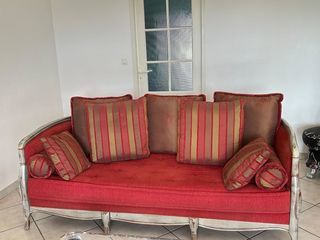 Canapés avec coussins rouge/vert entourage bois gris vieilli CROZATIER 300 € pièce ou 500 € les deux longueur 2m largeur 1m peuvent etre vendu séparément