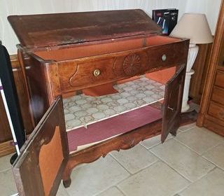 Un buffet ancien meuble à pétrir le pain, 200 euros, un petit fauteuil fleuri ancien 50 euros, et un bois de lit style ancien avant arrière + traverses 50 euros. (Tout ces meubles
