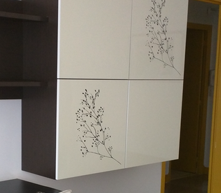 Joli meuble de rangement avec des motifs décoratifs. Couleur de face blanc crème et marron sur les caissons. Dimensions totales : H 120cm x L 120cm x P 38 cm. Chaque carré fait 6