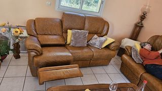 Ensemble salon cuir et bois Canapé 3 places relaxation électrique Canapé 2 places relaxation manuel Table de salon 120x60 Petit meuble rotatif