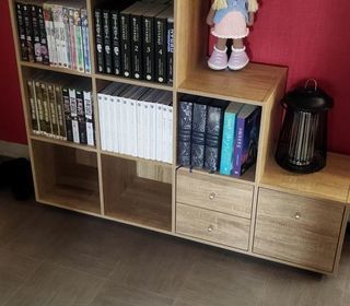vends meuble étagères 8 casiers 27 x 28 cm 3 tiroirs 116 x 116 x 30 cm en très bon état malgré 2 petits impacts en bas à droite 50€