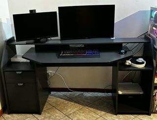 Bureau gaming avec un tiroir et un placard. Emplacement pour une tour d'ordinateur (que j'utilise pour l'imprimante) Dimensions : 180 large / 67 profondeur / 92 hauteur tota