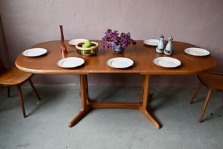 Classe magistrale et élégance intemporelle suffisent à décrire les lignes somptueuses de cette table scandinave en chêne des années 60. Son grand plateau ovale en bois est lumineux