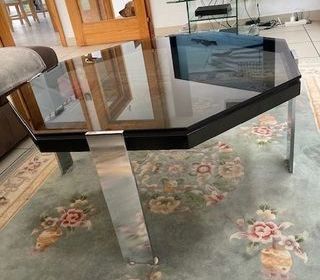 Belle table de salon octogonale, en verre fumé, sur socle en métal noir, 4 pieds chromés. Hauteur 0,44 m, Largeur 0,95 m. Tabler de qualité, en bon état.