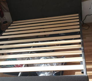 Lit structure bois. Maintient structure en fer, sommier à lattes fixation auto agrippante. Espace sous le lit pour y glisser des sac de rangement vêtements.