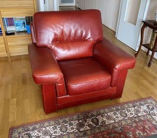 Fauteuil cuir très bon état. Couleur corail. Fabrication française. À retirer sur place.