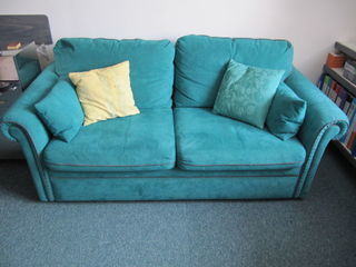 Canapé de la célèbre maison Jacques Coulon des Années 1992 longueur 190 cm profondeur 100 cm, tissus façon cuir retourné coloris turquoise . tarif de l'époque traduit en euros 28