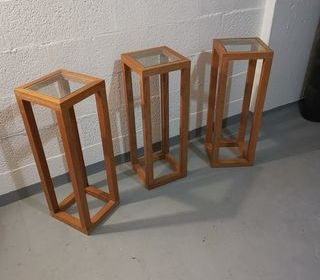 Stèles en bois massif en très bon état modèle ROCHE/BOBOIS. Plateaux dessus en verre de 25cmx25cm.Hauteur 70cm. Vendues par 3. A prendre sur place. Possibilité de donner 2 plateaux