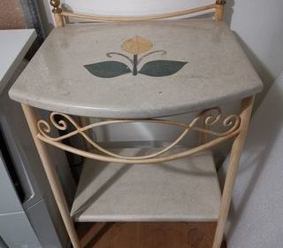 Petite table en métal couleur saumon pâle. Les deux plateaux sont en marbre. Le supérieur avec incrustation décorative florale. Très bon état. Hauteur 62cm. Profondeur 42cm. Large