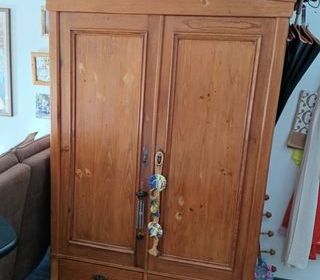 1 belle armoire ancienne avec 2 portes fermées à clefs, en bas de l'armoire 2 grands tiroirs. A l'intérieur 4 rayonnages de 44 cm de larges. L'armoire se démonte. Dimensions : Larg