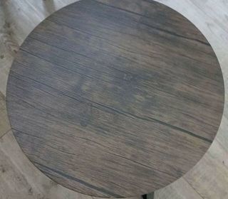 Bonjour, Je vends cette table basse ronde en bois avec un piètement en métal noir. - Type de produit : Table basse ronde/ Bout de canapé - Matériau : Bois - Couleur : Marron