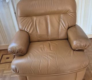Canapé 2 places + 1 fauteuil + 1 pouf assorti de style aviateur en cuir de vachette pleine fleur de couleur rouge racing avec coutures au point cellier recouvert de carlingue d'av