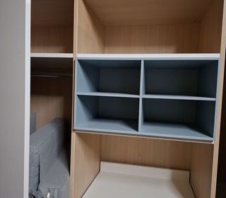 Dressing d'angle d'intérieur état neuf, couleur bois clair et blanc. Tiroirs amortisseurs -penderie. Possibilité de livraison et montage en supplément 450€ Dimensions sur photos