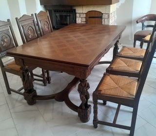 Av belle salle à manger Bretonne très propre avec 1 table avec ses rallonges 6 chaises 1 lustre et 1 bahut qui se sépare en deux pour le transport vend cause décès. Le tout est vra
