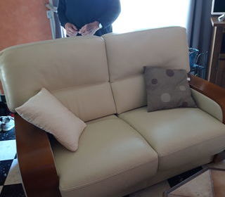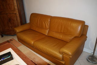 canapé cuir couleur beige accoudoirs bois 2/3 personnes. très bon état. L1.5m l0.9m venir chercher sur place