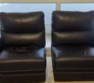 Canapé d?angle en tissu de couleur noire, comprenant plusieurs places assises et équipé de deux assises inclinables avec repose-pieds relevable, accoudoirs rembourrés et dossier ha
