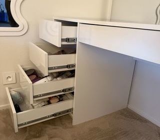 Je mets en vente une coiffeuse blanc laqué, achetée il y a 6 mois et en excellent état. Elle est équipée d'un miroir mural et de 5 tiroirs de rangement