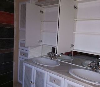 meubles salle de bain suspendu 140 avec 4 portes 3 tiroirs 2 vasques, 1 colonne 160 avec 2 tiroirs et 2 portes, 1 armoires miroirs 75x70 avec étagères. Bon état
