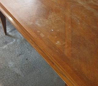 Grande table en bois pouvant accueillir 8 personnes , et avec les deux rallonges , 12 personnes . Son plateau est à revernir . 6 chaises de style Régence , assorties à la tab