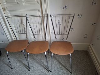 Vends 3 Chaises vintages années 60/70 skaï marron piétinent piqures sur le chrome. P:35 L:35 h:89 assisses: 46