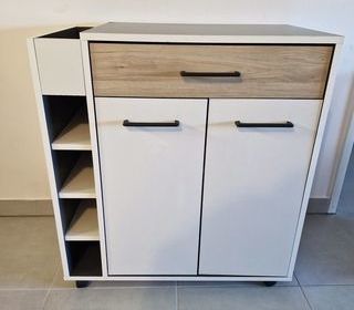 Très Bon état Juste des petites tâches dans le fond du tiroir (voir dernière photo) Desserte de cuisine blanche avec détails en chêne. Comprend deux portes avec une étagère i