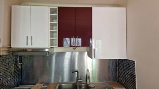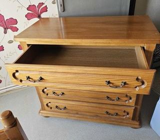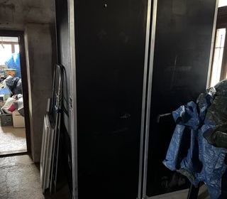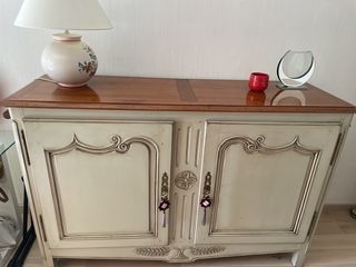 Je vends ce buffet bas en bois finition noyer laque brune avec 2 portes pliantes et 1 tiroir intérieur. 1 étagère assortie à accrocher au-dessus du buffet est vendue avec le buff