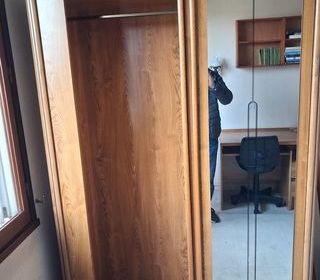 Armoire Gauthier bois avec portes coulissantes, dont une porte avec miroir intégré. L?armoire est de couleur bois naturel.1 côté 4 étagères,1 côté penderie,le tout en très bon etat