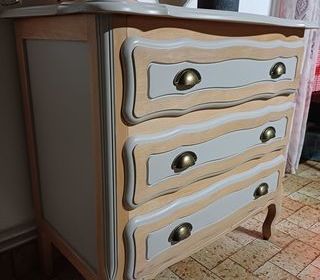 Commode relookée bois et gris clair La Celle-Saint-Avant (37) Dimensions : H 77,5 × L 80 × P 45,5 cm Petite commode entièrement relookée à la main : poncée, lazurée et peint
