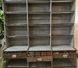 Meuble casier en métal ancien mais restauré avec 3 tiroirs (petits casiers a l'intérieur). Le meuble est en seul bloc Hauteur 210cm Largeur 124cm Profondeur 40cm Pas d'envoi