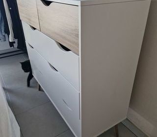 Commode style scandinave 5 tiroirs Dimensions : 100 x 40 x 100 cm (largeur, profondeur, hauteur) Bon état, seul défaut situé sur l'intérieur d'un des petits tiroirs (voir dern