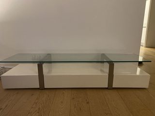 Beau meuble TV au design moderne, en blanc laqué et verre, idéal pour un salon contemporain. Très pratique avec ses 3 tiroirs de rangement. Dimensions : Longueur : 160 cm