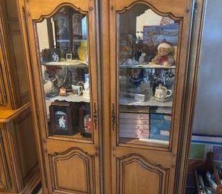 Vitrine en parfait état, bois de très bonne qualité chêne massif acheté chez COQUIN Hauteur 167 cm Profondeur 43 cm Longueur 114 cm Les portes et les étagères en verre sont ret