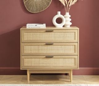 Commode "Amana" Marque Baita 3 tiroirs effet chêne et carnage rotin L80xP39. 5xH75cm Revêtement papier décor effet bois et 3 tiroirs rotin / Poignées métal -> Commode NEUVE -> J