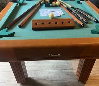 Superbe billard américain/français sur ardoise Plusieurs jeux de billes, 4 queues, support mural?. Tapis neuf