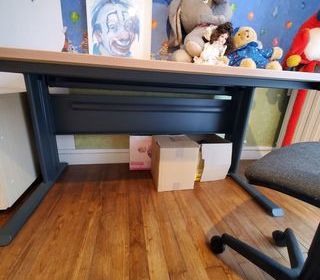 Bureau de marque Mobel Linea avec Plateau imitation bois Longueur 140 cms - Profondeur 80 cms - Hauteur 73 cms Bon état malgré quelques marques légères sur le plateau Meuble d