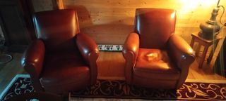 Fauteuil en cuir marron avec accoudoirs, dossier capitonné et assise rembourrée. Pieds boules en bois. Bon état apparent, idéal pour salon. Et un plus ! Le canapé se déplie at vo