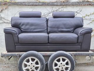 Canapé en cuir marron avec des appuis-tête réglables et des accoudoirs rembourrés. Confortable et en bon état, idéal pour tout salon.