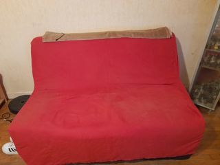 Lit pour enfant en forme de voiture rouge. Le lit comporte des motifs de course et une tête de lit à damier noir et blanc. Vendu sans sommier. En très bon état
