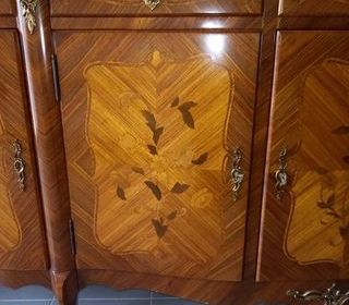 meuble marqueterie très bon état plaque de marbre beige aucun éclat 5 portes 5 tiroirs d'origine négociable contact par téléphone oà ¹ laisser message vocal je vous contactera