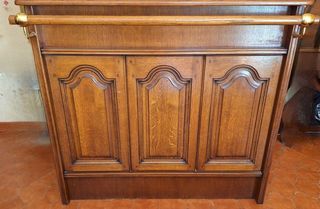 Vends bar chêne très bon état Longueur totale 120 cm Largeur totale (barre comprise) 43 cm Hauteur 105 cm 2 portes arrières coulissantes et 2 étagères sur toute la longueur pour v