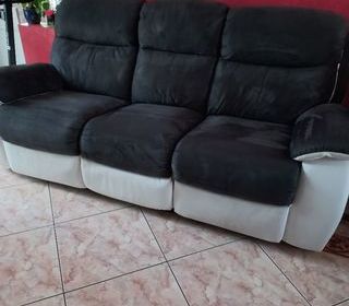 Canapé 3 places noir et blanc avec reposes pieds relax pour les jambes, largeur totale avec accoudoirs 2 mètres. Très bon état.