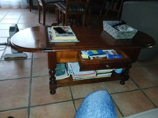 Table de salon Louis Philippe avec 1 battant de chaque coté permetant de réduire l'encombrement. Bon état, 1 tiroir, 1 plateau niveau des pieds, longeur fermée 80 X 47 longueur