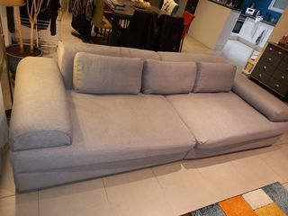 Grand canapé gris clair chiné 280cm 4/5 places. Il a quelques années mais le tissu a été refait à neuf sur mesure. Pour plus d'informations n'hésitez pas à me contacter.