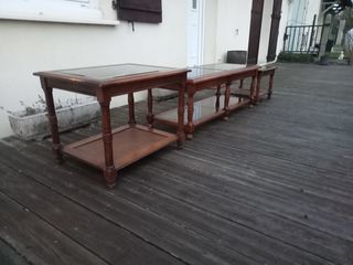Vend ensemble de 3 Table de salon ,bois massif avec une dessus verre et dessous verre bizotèe . dimensions 125 cm sur 50 cm et 44,5 de hauteur , la moyenne verre bizotée et dessous