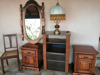 Lot 20 articles : 2 Tables de chevet 1 Miroir 1 Meuble vitré 1 Tablette 1 Petit meuble couture 4 Tapis (dont 2 petits photo 6) 2 Chaises 5 Lustres 1 Lampe 1 Applique 1