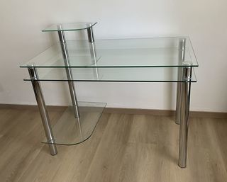 Bureau avec deux plateaux en verre et pieds gris métal, modèle HIVOHA, avec la notice de montage Bon état Dimensions : profondeur 60 cm, 105 cm de long, hauteur totale avec tous