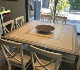 Vends cause double emploi ensemble table carrée 135 cms et 4 chaises. Plateau foncé et empiétements clairs.Hauteur table 78cms.Bicolore chêne vieilli et dessus imitation granit. Ch