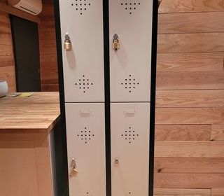 Ce vestiaire de 2 colonnes comporte 4 casiers. Chaque casier possède des portes étiquettes et 2 aérations. Il est possible de les fermer avec un cadenas Couleurs : marron et beige